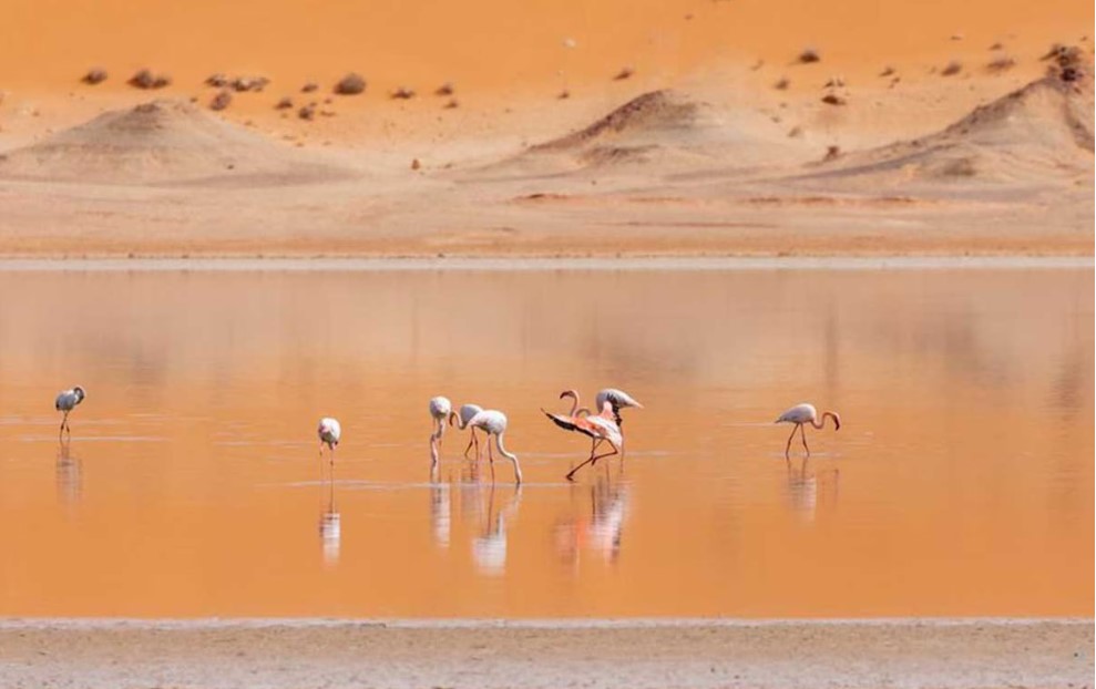 Visite de l'église Saint-Joseph et de la tombe de Charles de Foucault. Départ vers le lac salé de l'oasis pour découvrir le refuge des oiseaux migrateurs, où font escale les flamants roses et les cigognes. Contemplation du coucher de soleil autour d'un thé préparé au feu de bois.