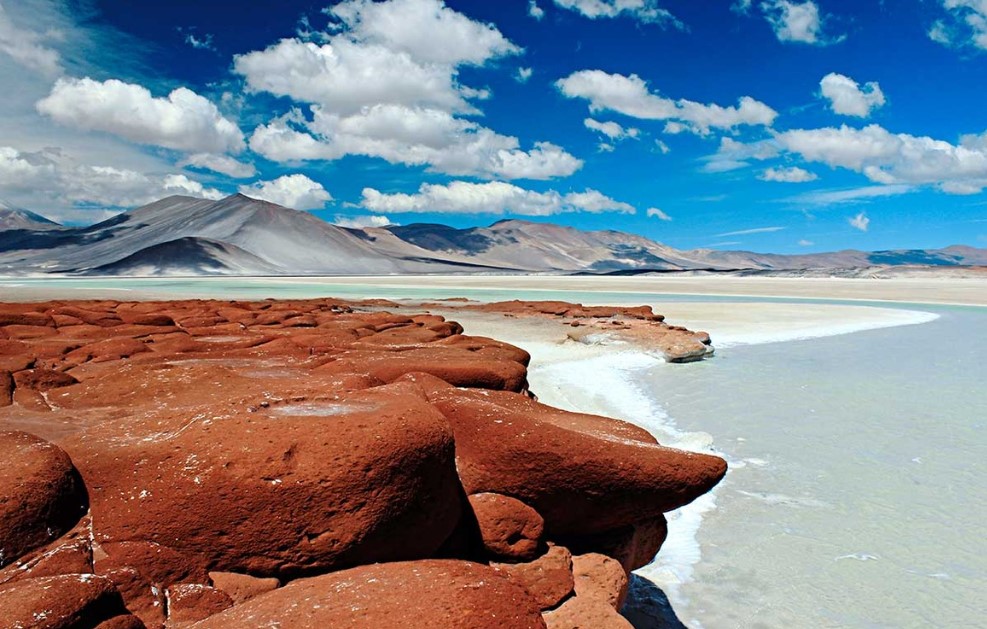 Aujourd'hui, vous prenez la direction de l'Altiplano. Arrivés à plus de 4 500 mètres d'altitude, vous découvrirez les magnifiques lagunes Miñiques et Miscanti, situées dans la réserve nationale "Los Flamencos". Arrêt au village de Socaire pour admirer le Salar d’Atacama, une spectaculaire étendue de sel d’une superficie d’environ 3 000 km². À l'intérieur du Salar, vous pourrez contempler la lagune de Chaxa, l’un des nombreux habitats des flamants roses.