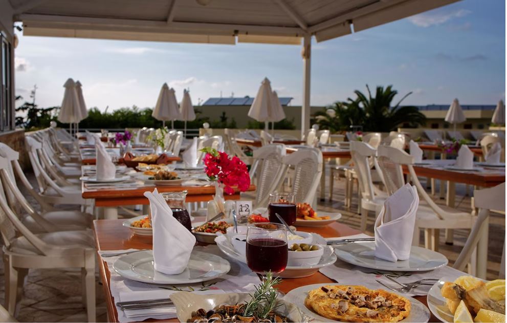 • Restaurant principal "Hermès", climatisé, avec terrasse extérieure ombragée et buffets variés à volonté : cuisine internationale et locale, buffet à thèmes, show cooking, snack…• Restaurant de spécialités crétoises "Jasmine" : 1 dîner par personne par semaine inclus, menu de specialités locales, sur réservation. Ouvert selon saison et météo, de mai à octobre.