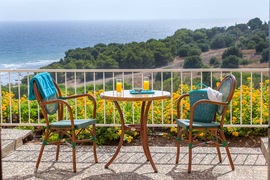 • Belle plage de sable fin en contrebas (env. 400 m, accès par un sentier piéton avec nombreuses marches déconseillé aux personnes à mobilité réduite) aménagée avec douche, parasols, transats gratuits à partir du 2ème rang (les transats des 1er rangs sont payants), serviettes avec caution 15€, Change de la serviette de plage payant : 5€.• Piscine extérieure avec parasols et transats (serviettes pour 15€ par semaine).